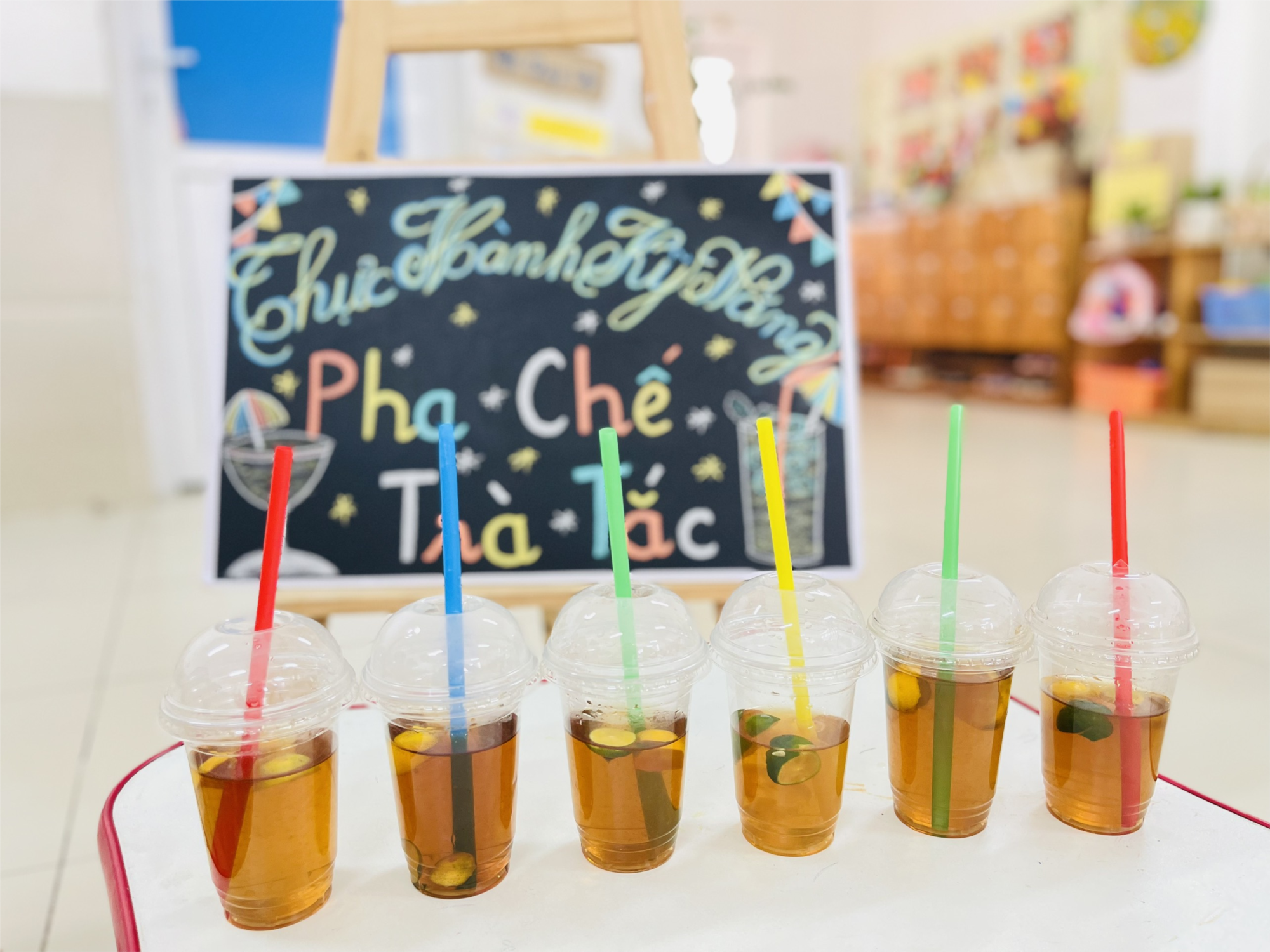 Ảnh: Không gian chuẩn bị để các con cùng cô trải nghiệm pha trà tắc.