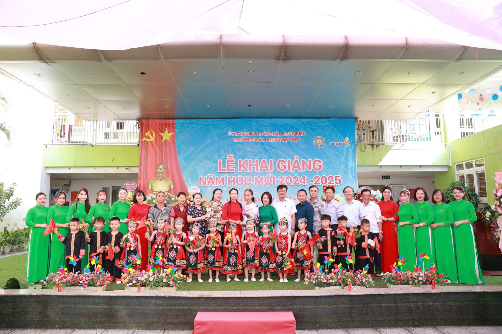 Tập thể CBGVNV và các bé học sinh chụp ảnh lưu niệm cùng các vị đại biểu.