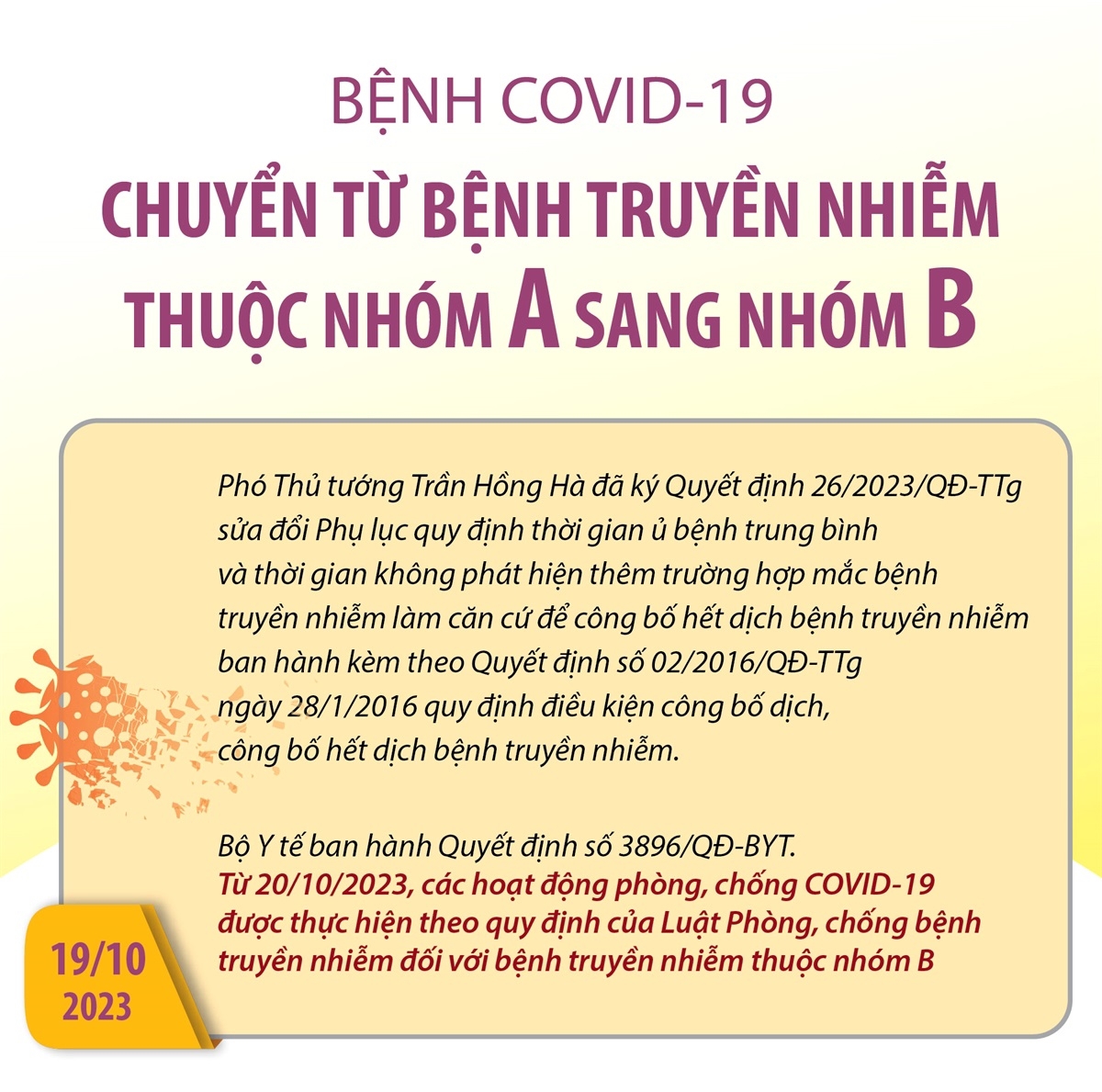 Luật Phòng, chống bệnh truyền nhiễm năm 2007 và có hiệu lực thi hành từ ngày 20/10/2023 đồng thời ban hành hướng dẫn việc áp dụng các biện pháp phòng, chống dịch COVID-19 phù hợp với dịch bệnh nhóm B.
