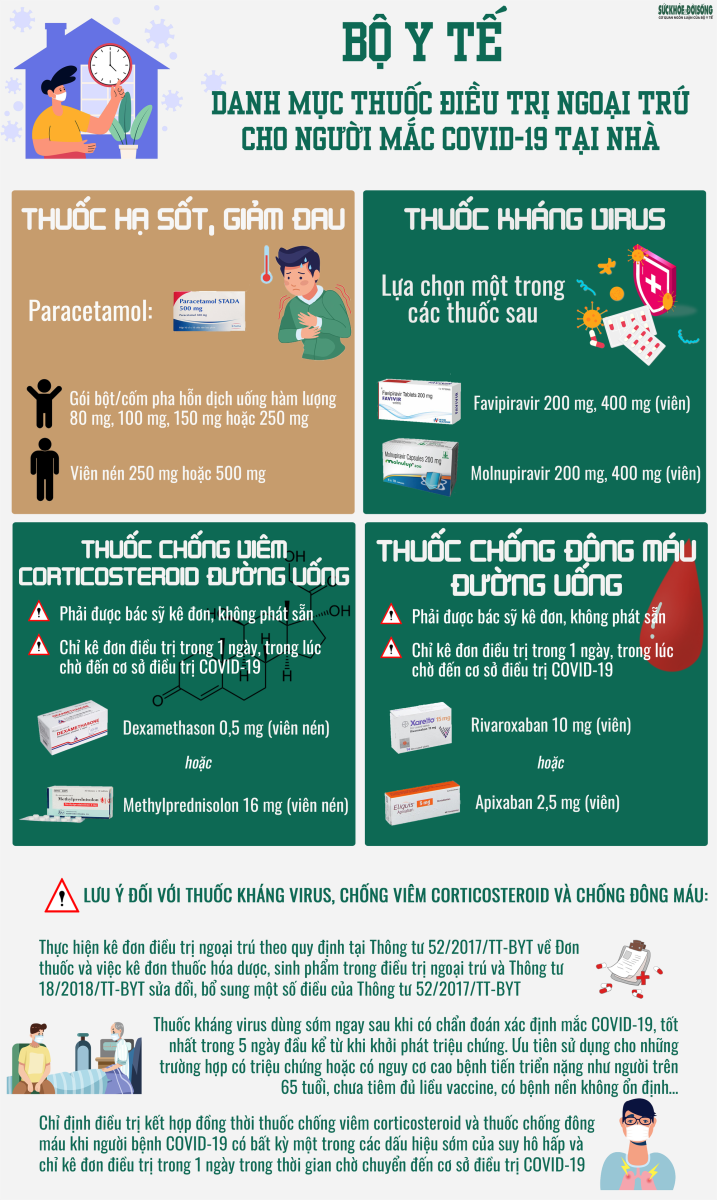 - Thuốc chống đông máu đường uống: Thuốc không phát sẵn cho người mắc COVID-19, thuốc phải được bác sĩ kê đơn theo quy định tại Hướng dẫn chẩn đoán và điều trị COVID-19 do Bộ Y tế ban hành và chỉ kê đơn điều trị trong một ngày trong thời gian chờ chuyển đến cơ sở điều trị người bệnh COVID-19. Lựa chọn một trong các thuốc sau: