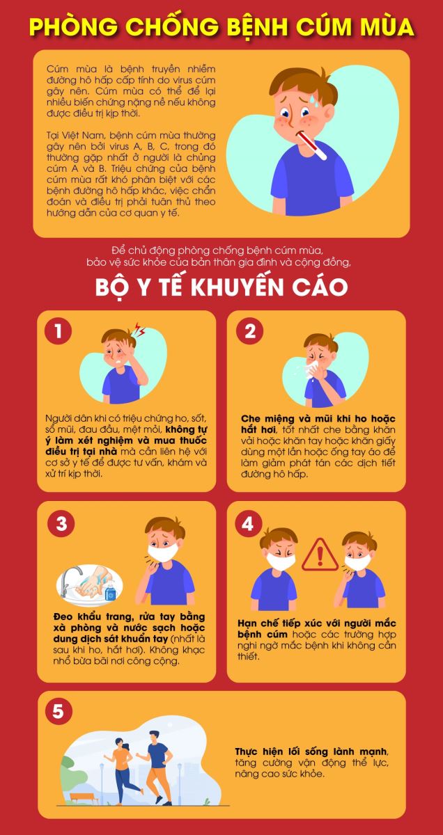 Chính vì vậy, các chuyên gia y tế khuyến cáo, để phòng tránh bệnh cúm mùa, ngoài việc giữ vệ sinh sạch sẽ, rửa tay thường xuyên, che miệng và mũi khi ho, tránh đến nơi đông người,… thì việc tiêm phòng cúm hàng năm là điều cần thiết. Nhất là ở những người có nguy cơ biến chứng như trẻ em dưới 5 tuổi, người già trên 65 tuổi, phụ nữ có thai, người suy giảm miễn dịch như bệnh nhân HIV, người mắc các bệnh lý nền mạn tính.
