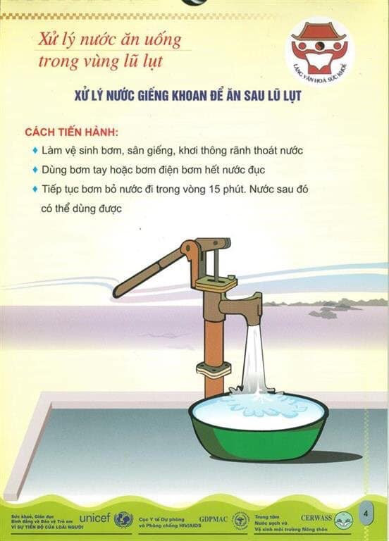 Làm vệ sinh thành và nền giếng, khơi thông nước ngập lụt quanh giếng.