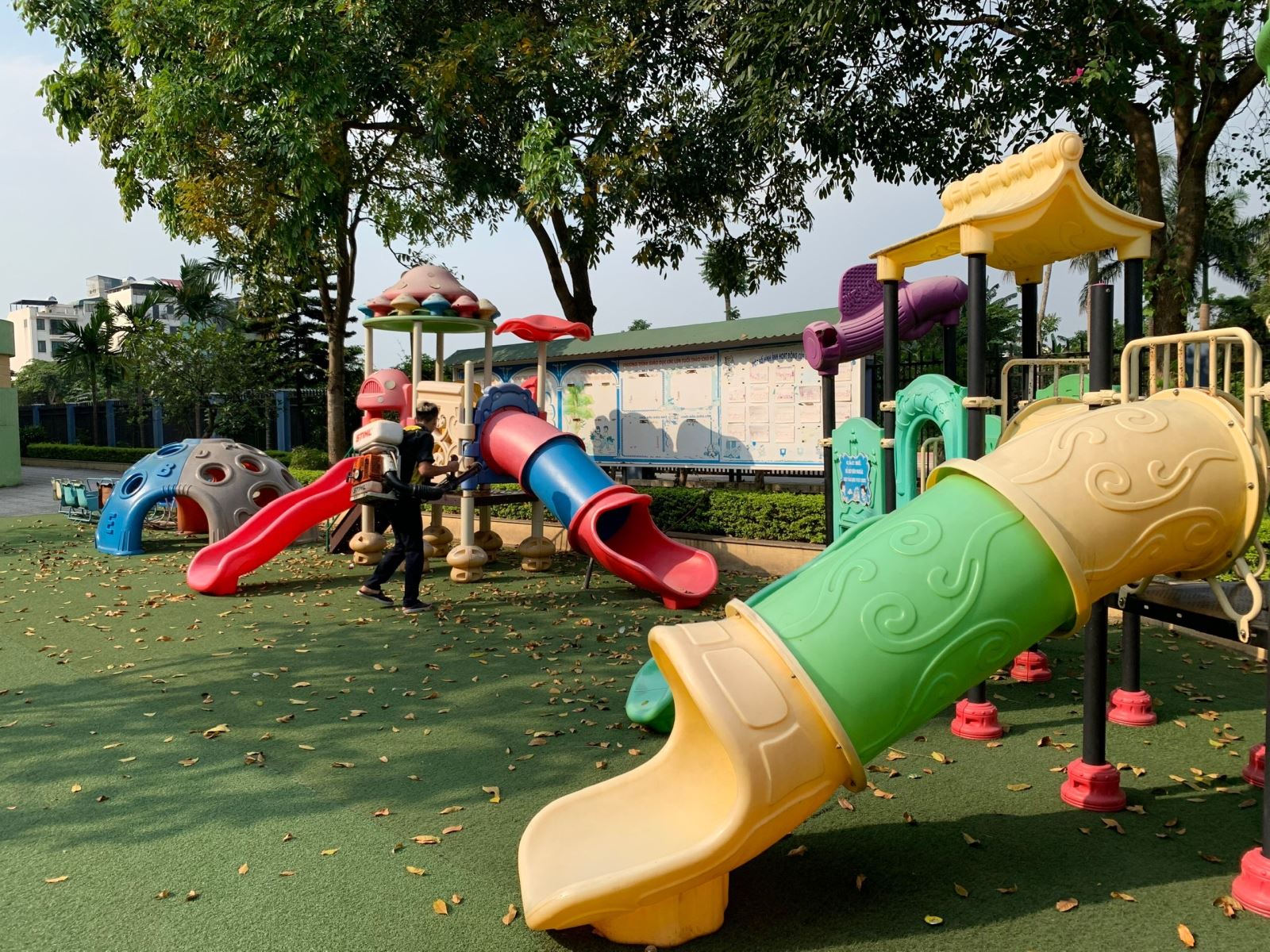 Mùa mưa là khoảng thời gian muỗi sinh sản và phát triển rất nhanh. Để phòng chống bệnh sốt xuất huyết và diệt trừ muỗi trong trường học, chiều ngày 03 tháng 9 năm 2022, trường Mầm non Ngọc Thụy đã phối hợp với Hộ kinh doanh cửa hàng Phương Nguyên tiến hành phun thuốc diệt muỗi trên phạm vi toàn trường. Nhân viên của Công ty đã phun thuốc diệt muỗi và côn trùng tại các khu vực trong trường học bao gồm: phòng học, phòng làm việc, phòng chức năng, hành lang, bếp ăn, khu vệ sinh, nền nhà, cầu thang, sân trường, vườn cây trường, đồ chơi ngaoif trời...