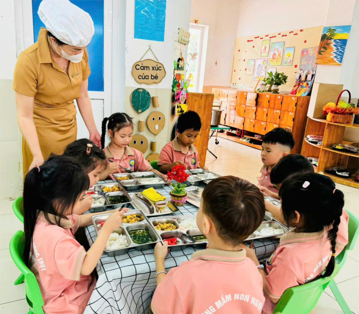 Đội ngũ nhân viên nuôi dưỡng được tập huấn đầy đủ về an toàn thực phẩm, luôn sử dụng trang phục bảo hộ khi chế biến và chia khẩu phần ăn cho trẻ. Thức ăn sau khi nấu được bảo quản đúng quy định, chia suất kịp thời, đảm bảo luôn tươi ngon và an toàn. Với sự quan tâm và thực hiện nghiêm túc các quy định về vệ sinh an toàn thực phẩm, Trường Mầm non Ngọc Thụy luôn nỗ lực mang đến cho trẻ những bữa ăn không chỉ ngon miệng mà còn an toàn, góp phần xây dựng môi trường học tập lành mạnh và thân thiện.