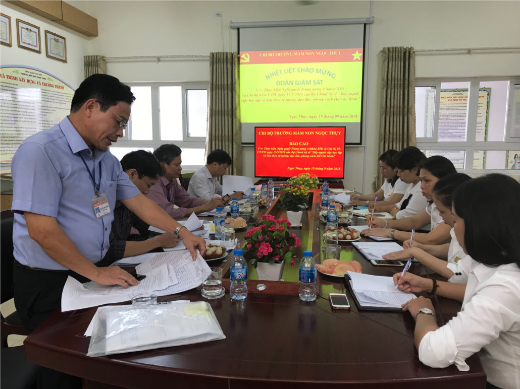 Thực hiện quyết định số 336-QĐ/ĐU ngày 07/9/2018 của UBKT Đảng ủy phường Ngọc Thụy về việc kiểm tra đối với Chi bộ Trường Mầm non Ngọc Thụy trong việc thực hiện Nghị quyết Trung ương 4 (khóa XII) và Chỉ thị 05-CT/TW ngày 15/5/2016 của Bộ Chính trị. Việc quán triệt hướng dẫn số 14- HD/QU.Đoàn kiểm tra, giám sát đã nghe Báo cáo của Chi ủy chi bộ. Qua kiểm tra hồ sơ, sổ sách về việc thực hiện Nghị quyết và Chỉ thị, Đoàn đã đưa ra những câu hỏi để Cấp ủy Chi bộ giải trình. Đoàn đã lập Biên bản kiểm tra, giám sát và sẽ họp bàn, đưa ra kết luận sớm nhất gửi về Chi bộ.