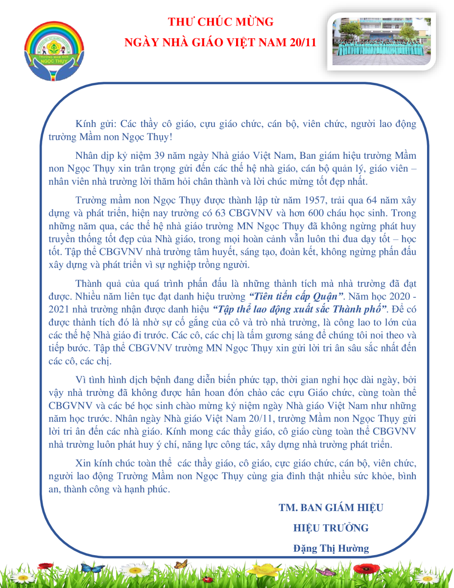Xin kính chúc toàn thể các thầy giáo, cô giáo, cực giáo chức, cán bộ, viên chức, người lao động Trường Mầm non Ngọc Thụy cùng gia đình thật nhiều sức khỏe, bình an, thành công và hạnh phúc!