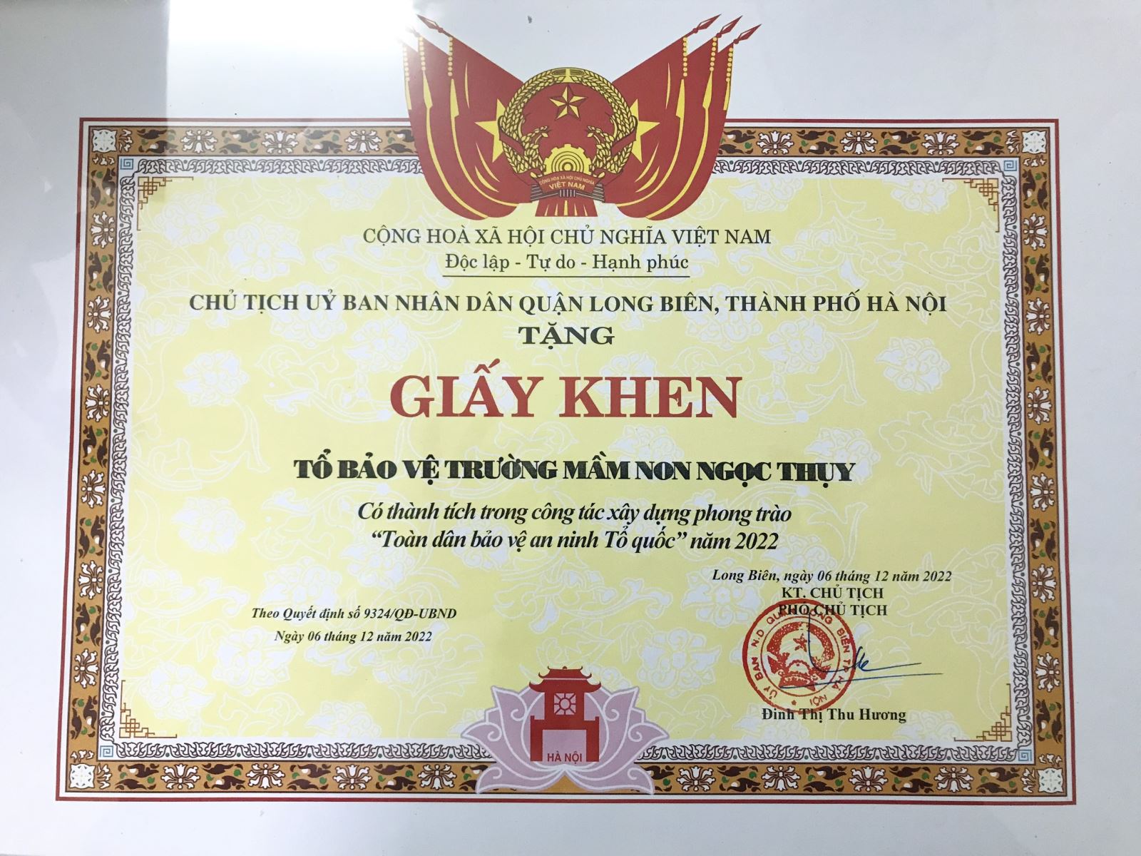 Chúc mừng tổ Bảo vệ trường MN Ngọc Thuỵ đã được Chủ tịch UBND Quận Long Biên tặng Giấy khen đã có thành tích trong công tác xây dựng phong trào “Toàn dân bảo vệ an ninh Tổ quốc” năm 2022.