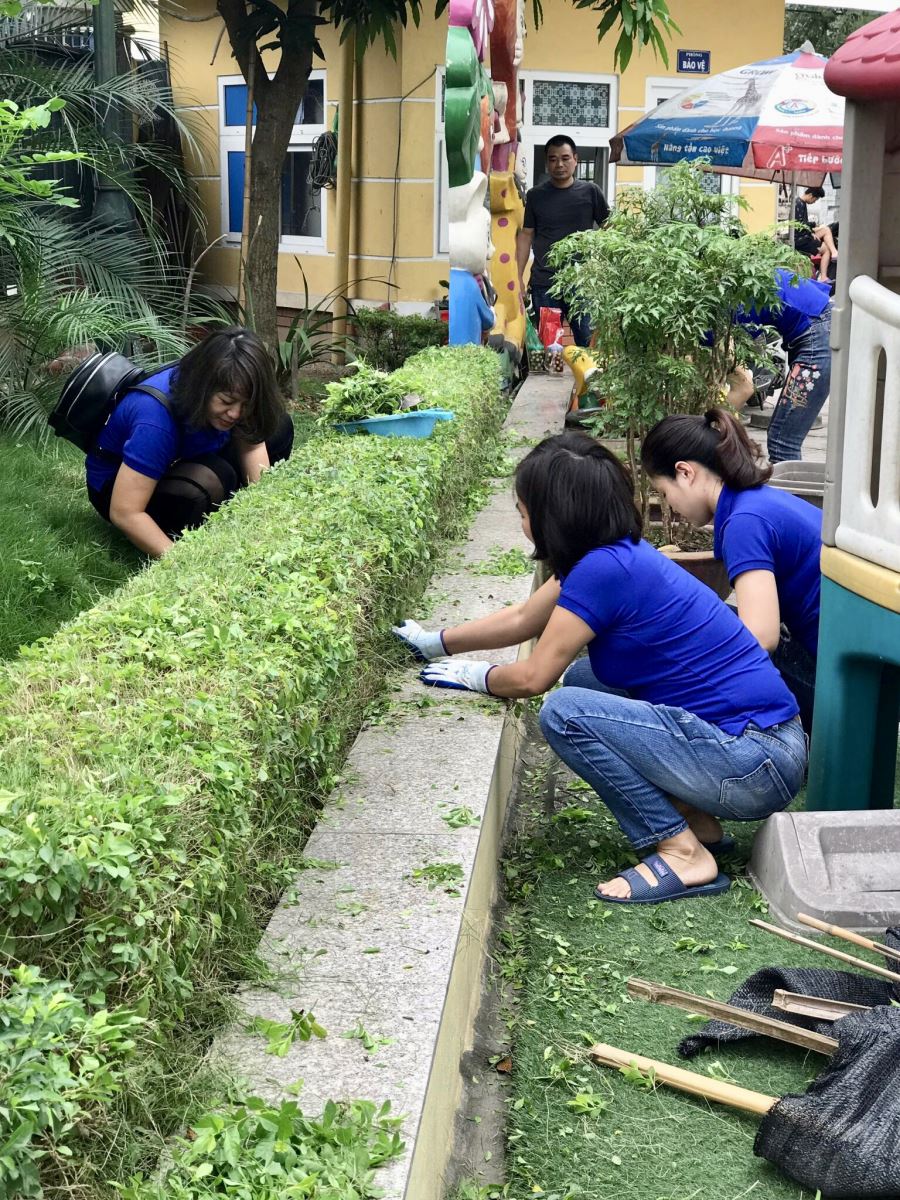 Công tác vệ sinh được thực hiện tại toàn bộ các phòng học, phòng chức năng, cầu thang, lan can, sân trường và ngoài khu vực trường. Nhà trường tiến hành vệ sinh, kiểm tra đọng nước đặc biệt trong chậu không dùng, các đĩa lót chậu hoa , rắc vôi bột tại các cống, cắt tỉa cây cối, phát quang bụi rậm, cọ rửa đồ chơi ngoài trời, sân trường, khu vực xung quanh ngoài trường sạch sẽ, các thùng rác được vệ sinh trong và ngoài, sắp xếp đúng nơi quy định.
