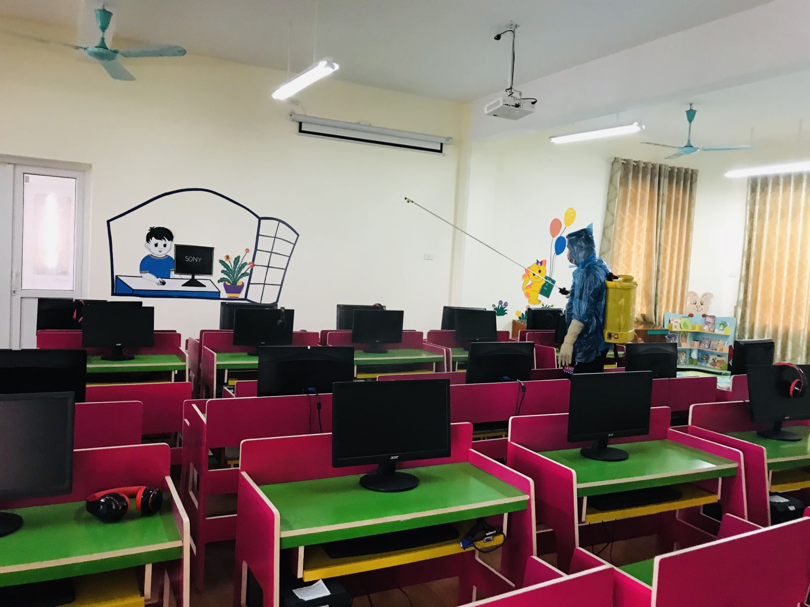 Nhà trường đã xây dựng đầy đủ kế hoạch phòng chống bệnh viêm đường hô hấp cấp do virus Corona, thực hiện tốt việc theo dõi và quản lý tốt sức khỏe học sinh, giáo viên, cán bộ, nhân viên nhà trường. Bên cạnh đó nhà trường triển khai thực hiện phun khử khuẩn toàn trường: đồ chơi, giá kệ, lớp học, các phòng chức năng, phòng làm việc, bếp ăn…... Đây là việc làm rất cần thiết với tình hình dịch bệnh diễn ra hiện nay, nhằm ngăn ngừa, phòng chống việc lây lan, phát triển của dịch bệnh, giúp tạo môi trường tốt nhất cho học sinh học tập và hoạt động.