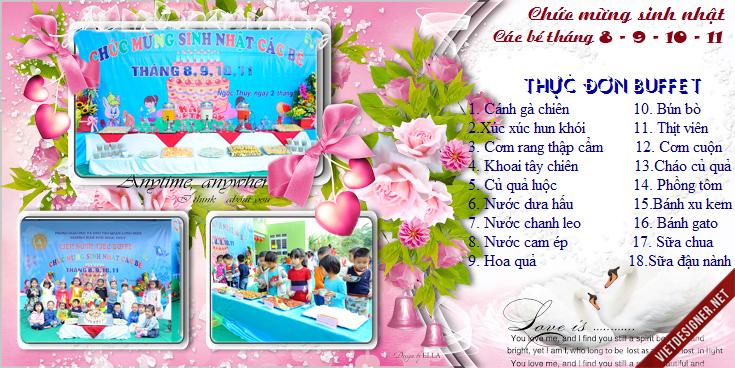 Ngày 08/11/2017, TRƯỜNG MN NGỌC THỤY TỔ CHỨC LIÊN HOAN TIỆC BUFFET SINH NHẬT CÁC BÉ THÁNG 8,9,10,11. Vì vậy nhà trường thông báo tới các bậc phụ huynh cho các con đi học đầy đủ và mặc áo đồng phục của nhà trường để tham dự chúc mừng sinh nhật các bạn.