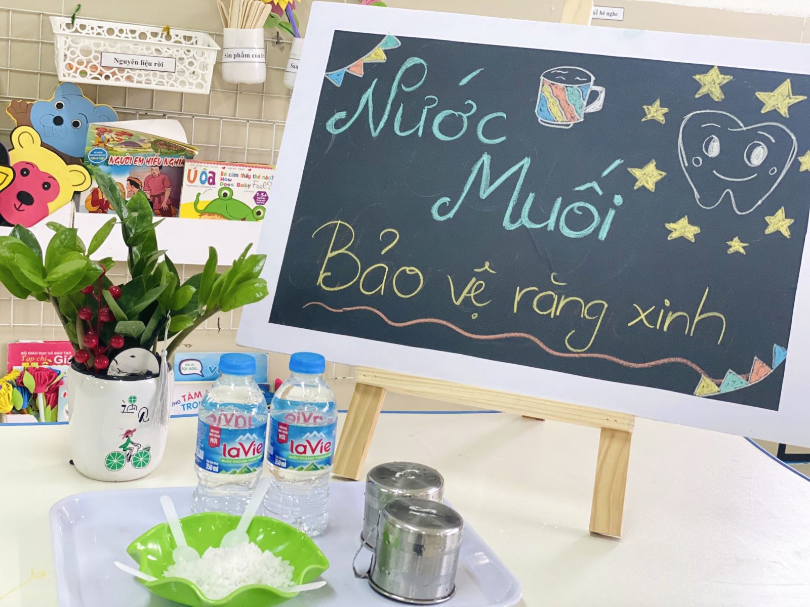 Hôm nay, các bé lớp MGB B2 đã cùng nhau học pha nước muối để súc miệng sau giờ ăn, giữ gìn vệ sinh những chiếc răng xinh. Sau khi quan sát cô giáo giới thiệu, hướng dẫn hoạt động, mỗi bạn nhỏ đã chọn một chai nước lọc, một chiếc thìa để xúc muối và lắc đều chai nước một cách đầy hào hứng.