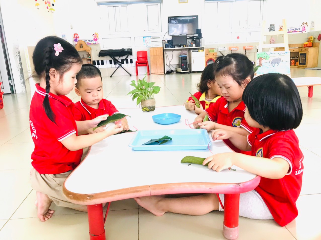 Giờ chơi hôm nay của các em bé MGB C2 đã trở thành 1 giờ chơi vô cùng gần gũi thiên nhiên, khi con được cô hướng dẫn làm những chú “Nghé ọ” từ lá cây ở vườn trường.