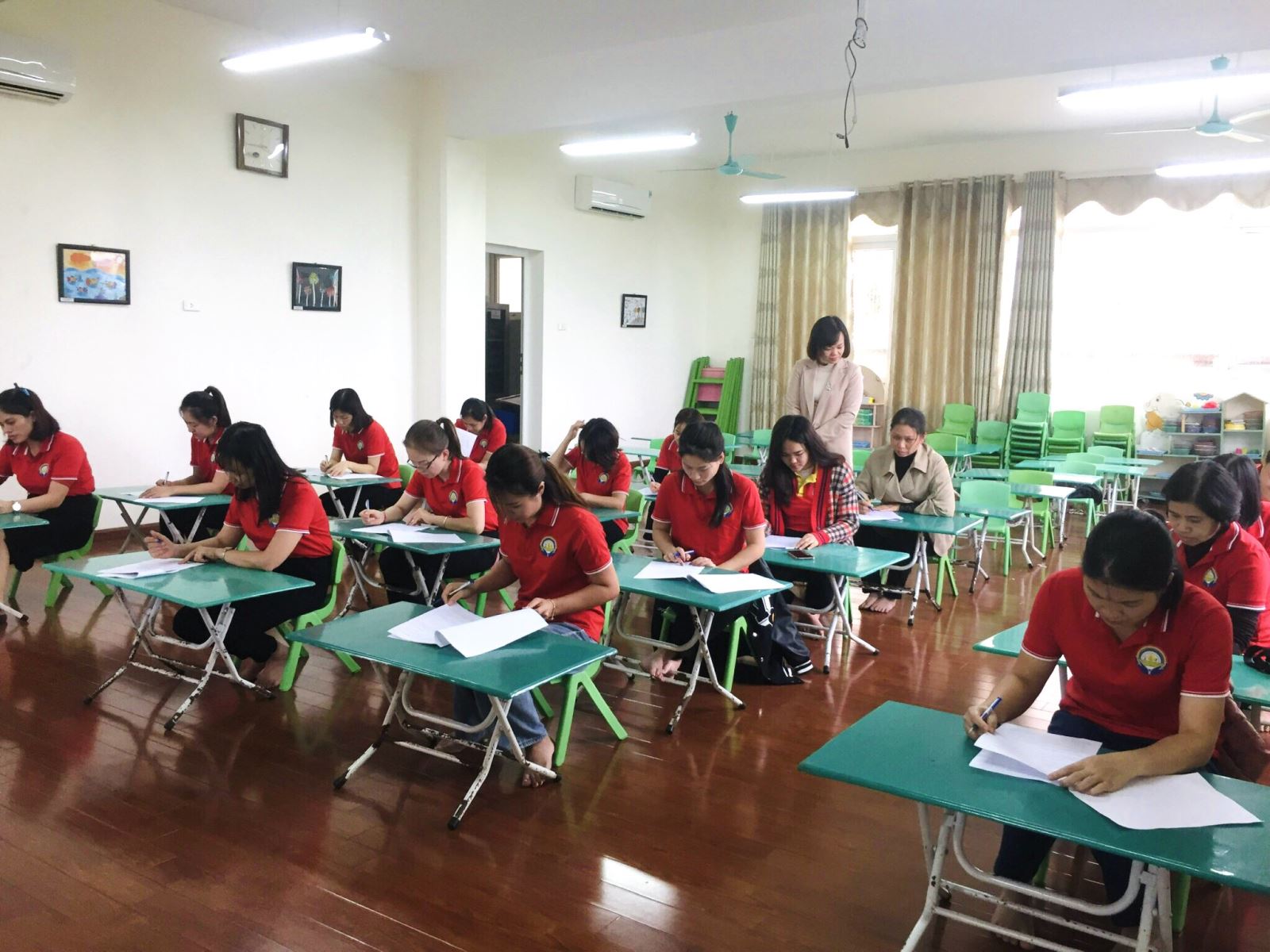 Sau khi khai mạc, các đồng chí giáo viên, nhân viên bước vào phần thi lý thuyết “Quy chế chăm sóc giáo dục trẻ”. Phần thi lý thuyết đã được hoàn thành sau 45 phút làm bài nghiêm túc và đúng theo quy chế của hội thi đề ra. Sau đó các đồng chí giáo viên, nhân viên đã được bốc thăm đề tài để tham gia phần thi thực hành.