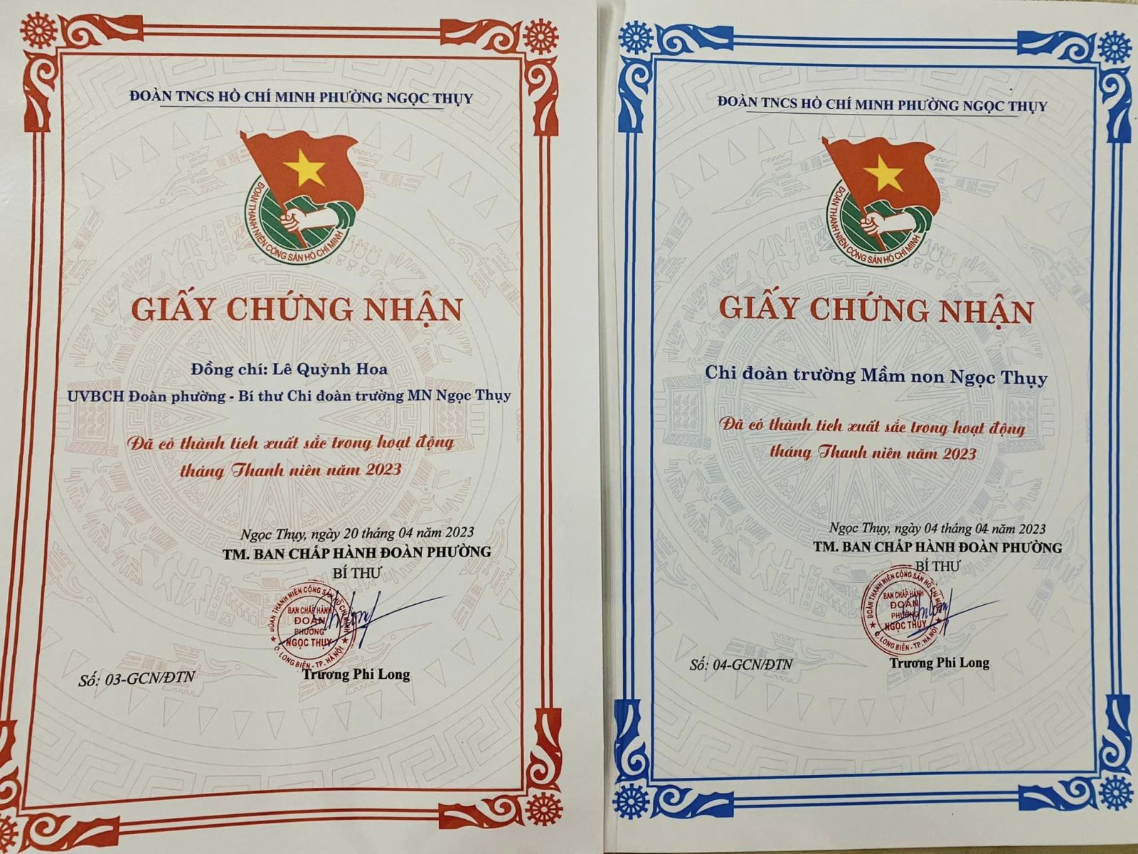 Chi đoàn Trường MN Ngọc Thụy vinh dự được nhận Giấy khen của BCH Đoàn TNCS HCM Phường Ngọc Thụy vì đã có thành tích xuất sắc trong tháng thanh niên; đ/c Lê Quỳnh Hoa - Bí thư Chi đoàn vinh dự được nhận Giấy khen của BCH Đoàn TNCS HCM Phường Ngọc Thụy vì đã có thành tích xuất sắc trong tháng thanh niên.