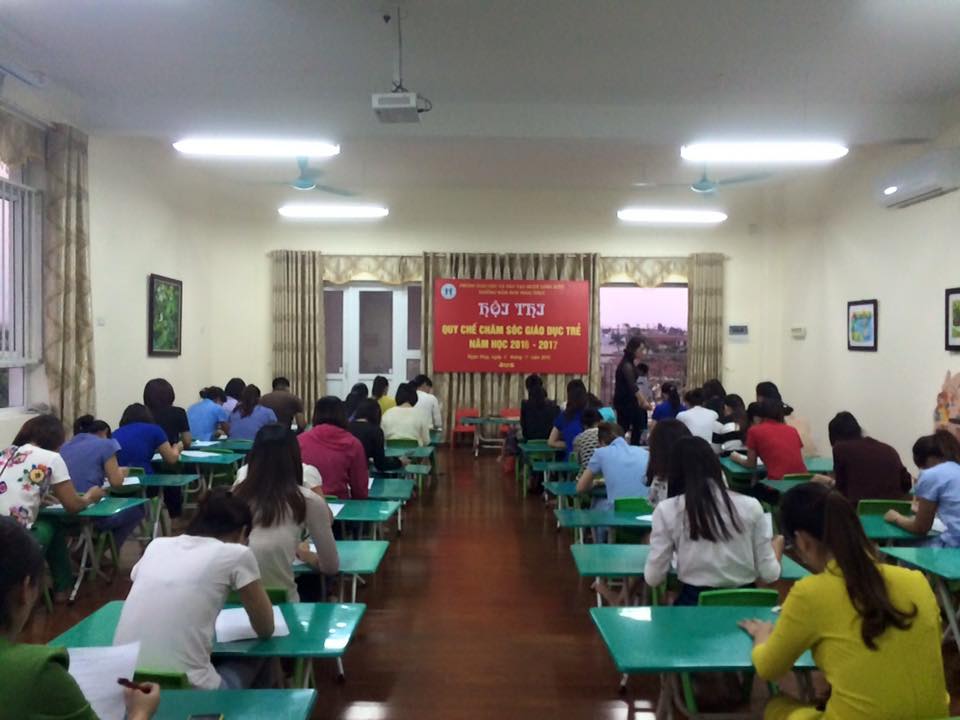 Sau khi khai mạc, các đồng chí giáo viên, nhân viên bước vào phần thi lý thuyết “Quy chế chăm sóc giáo dục trẻ”. Phần thi lý thuyết đã được hoàn thành sau 45 phút làm bài nghiêm túc và đúng theo quy chế của hội thi đề ra. Sau đó các đồng chí giáo viên, nhân viên đã được bốc thăm đề tài để tham gia phần thi thực hành.