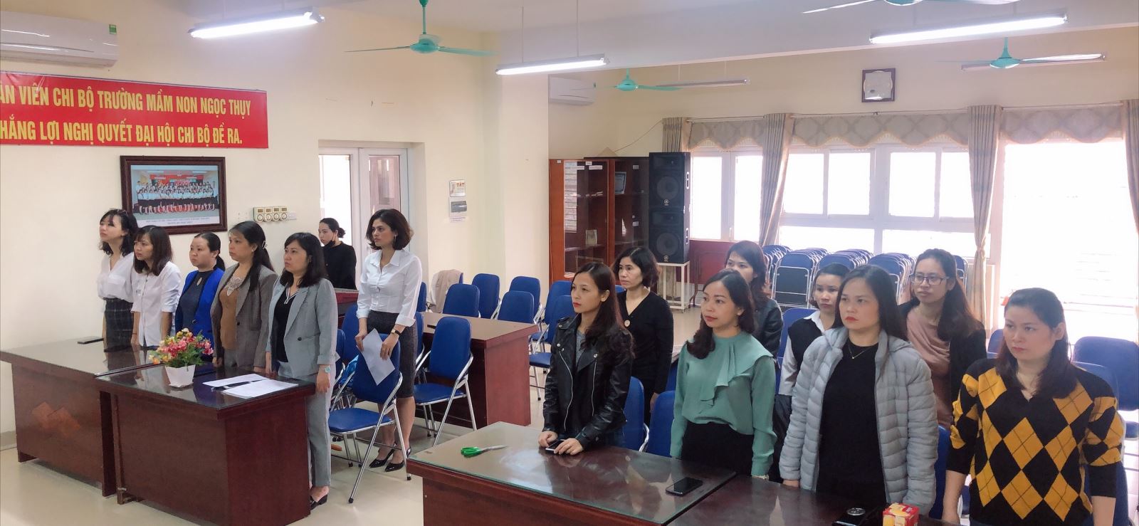 Tới dự buổi lễ có toàn thể đảng viên, đoàn viên ưu tú trường Mầm non Ngọc Thụy. Buổi Lễ được tổ chức trang nghiêm, đúng theo quy định của Điều lệ Đảng.